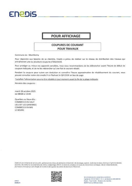 Pour répondre aux besoins de sa clientèle, ENEDIS a prévu de réaliser des travaux sur le réseau de distribution, qui entraîneront une ou plusieurs coupures d’électricité.