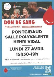 Une collecte de don du sang est organisée à Pontgibaud le lundi 27 avril, de 15h30 à 19h00, à la salle polyvalente. Cet événement est mis en place par l’Établissement Français du Sang (EFS), avec la participation de l’association locale pour le don de sang bénévole.