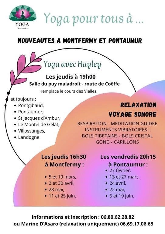 Des cours sont également proposés par l’association “Yoga pour tous” dans d’autres communes du secteur : Pontgibaud, Pontaumur, Saint-Jacques-d’Ambur, Le Montel-de-Gelat, Villossanges et Landogne.