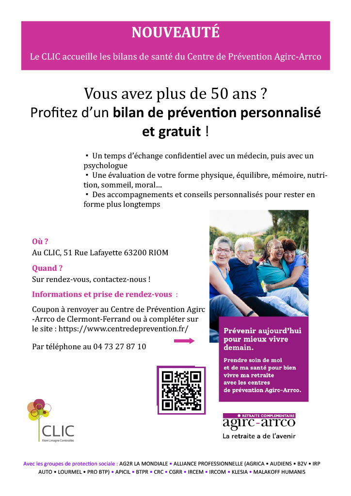 Le CLIC Riom Limagne Combrailles accueille désormais dans ses locaux, au 51 rue Lafayette à Riom, les bilans de santé du Centre de Prévention de l’Agirc-Arrco.