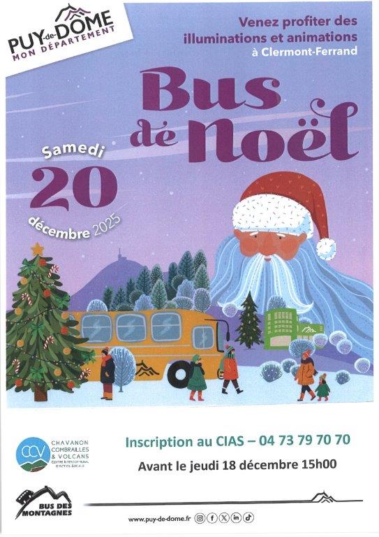 Le samedi 20 décembre 2025, le CIAS Chavanon Combrailles et Volcans, en partenariat avec le Département du Puy-de-Dôme, propose un aller/retour en Bus des Montagnes pour profiter du Marché de Noël et des festivités de Clermont-Ferrand.